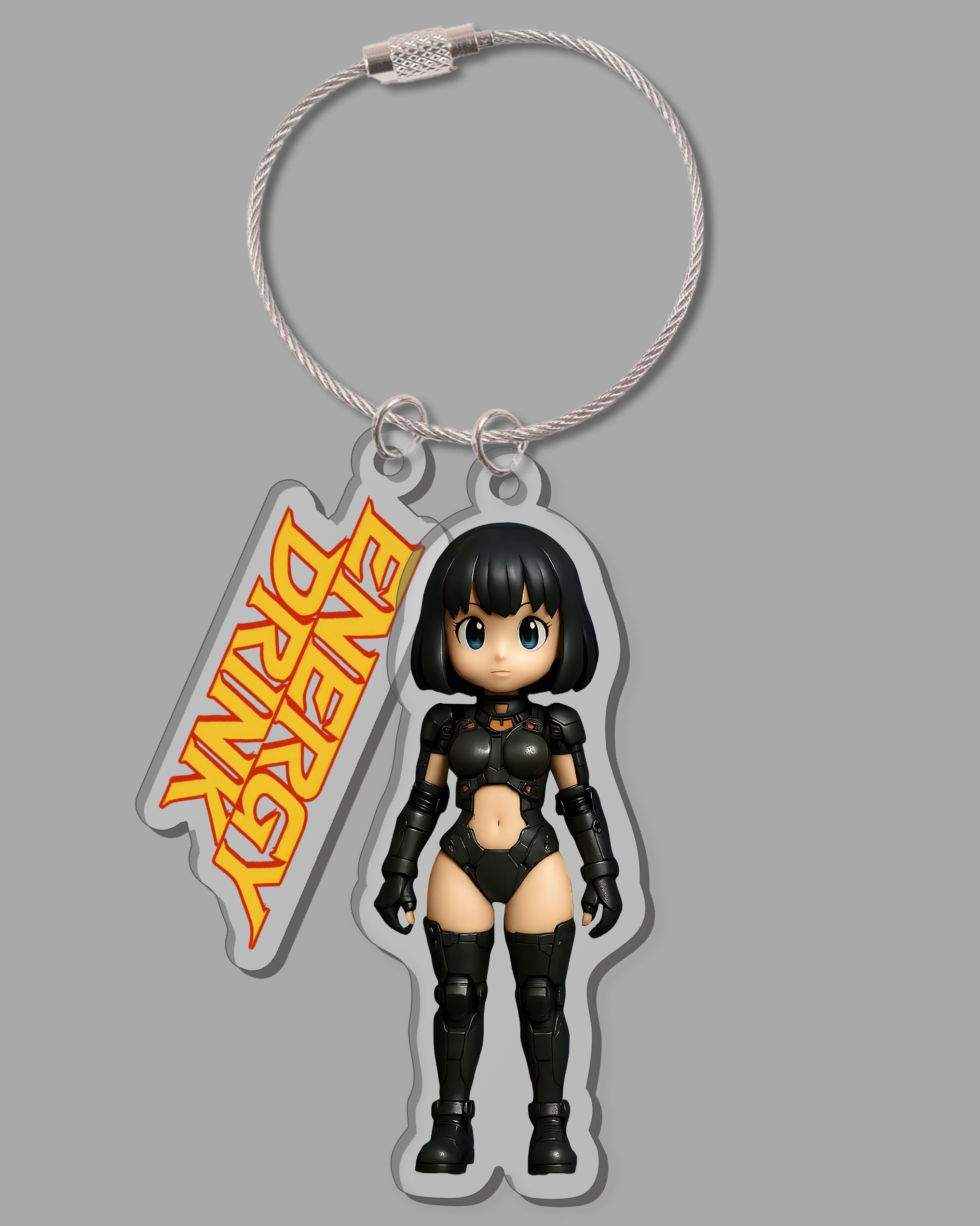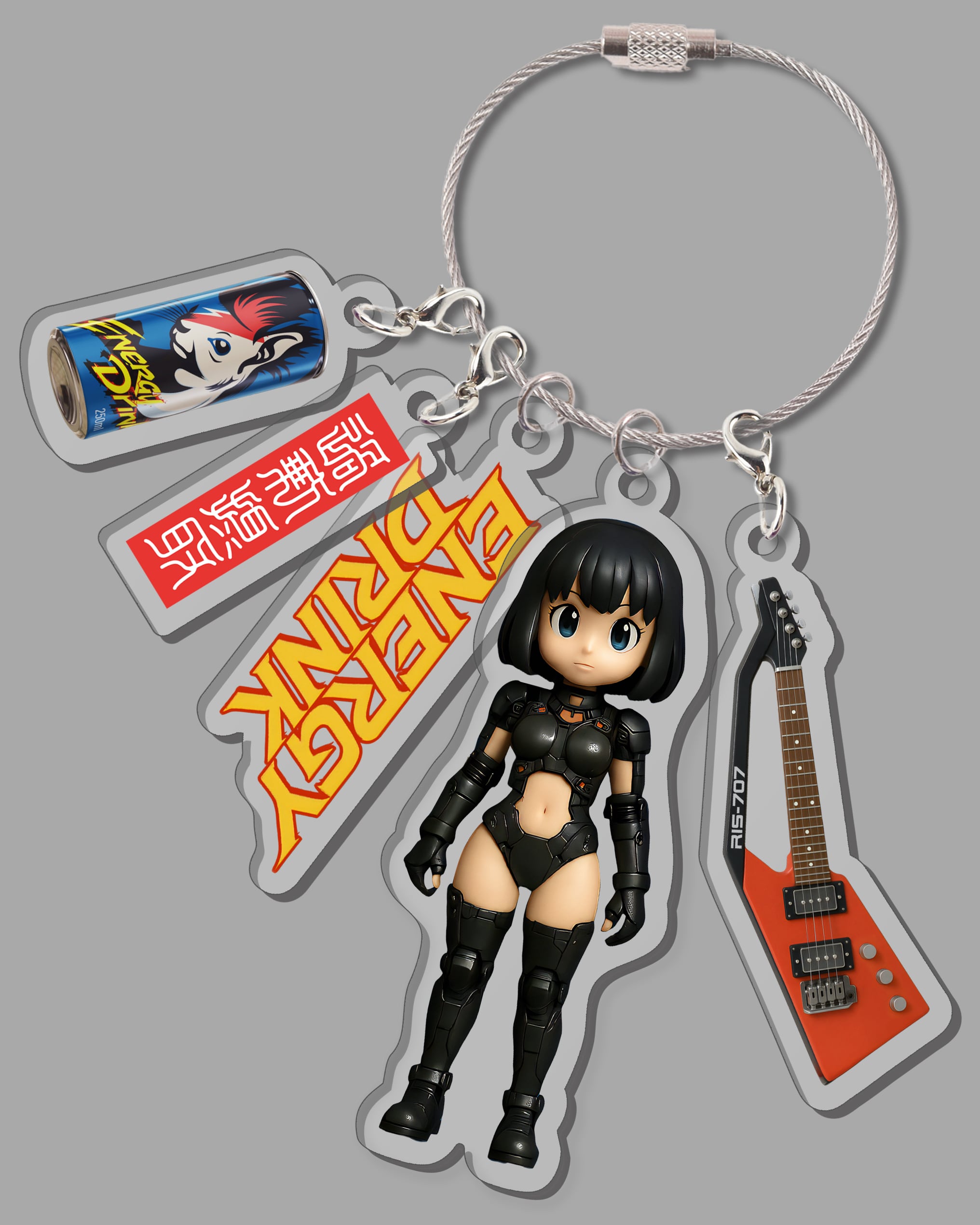 ENERGY DRINK ジャケットやMVに登場するサイバーパンクなRISをフィギュア化したキャラクターとロゴの2連アクリルキーリング。別売りのアクリルチャームを追加してジャラ付けカスタムしてね!(2枚枚目は コンプリートジャラ付けイメージ)